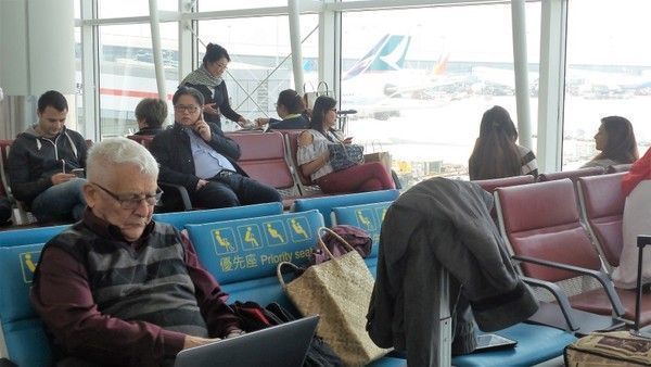 L’avion de Philippines Airlines est à l’heure. Décollage à 7h50 et nous arrivons à Hongkong à 10h. Comme nous n’avons pas pu avoir les cartes d’embarquements pour les autres tronçons du voyage à Manille, nous devons aller au guichet du transfert. Nous arrivons dans les premiers et évitons ainsi de faire la queue. Je demande à l’hôtesse de vérifier la prise en compte de nos bagages et nous allons en salle d’embarquement.