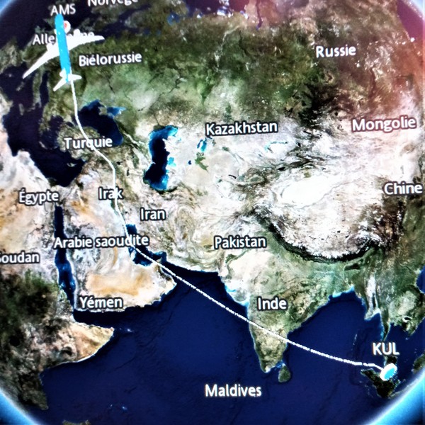 Le vol entre Manille et Kuala Lumpur ne dure que 3h30. Le pilote veut essayer de rattraper son retard et réduit le temps d’escale. Nous sommes autorisés à rester dans l’avion. Les passagers embarqués à Kuala Lumpur montent à bord et l’avion est plein. La nourriture à bord des avions de KLM est toujours aussi médiocre.