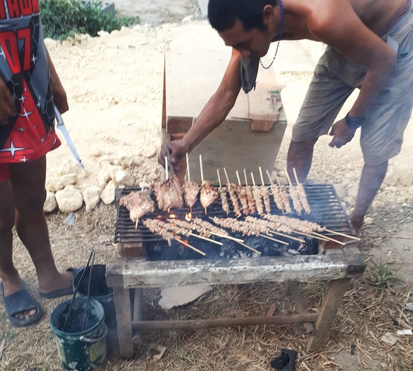 Les brochettes sont un peu spéciales, ce sont des intestins de poulet qu’elle a passé la matinée à nettoyer, qu’elle a mis à macérer dans une sauce faite de citron, de soja et d’huile et qui sont plissés en accordéon sur une brochette en bambou.